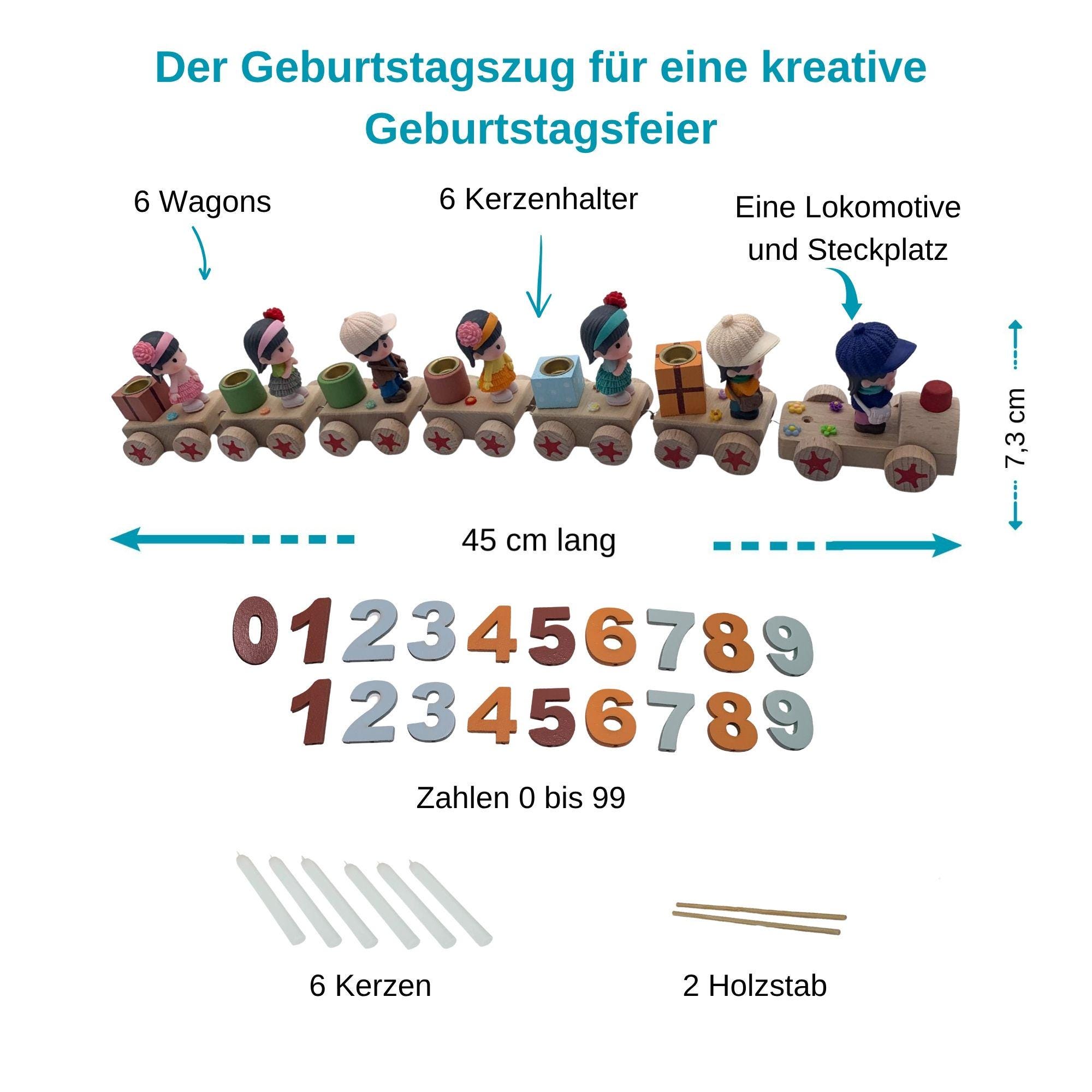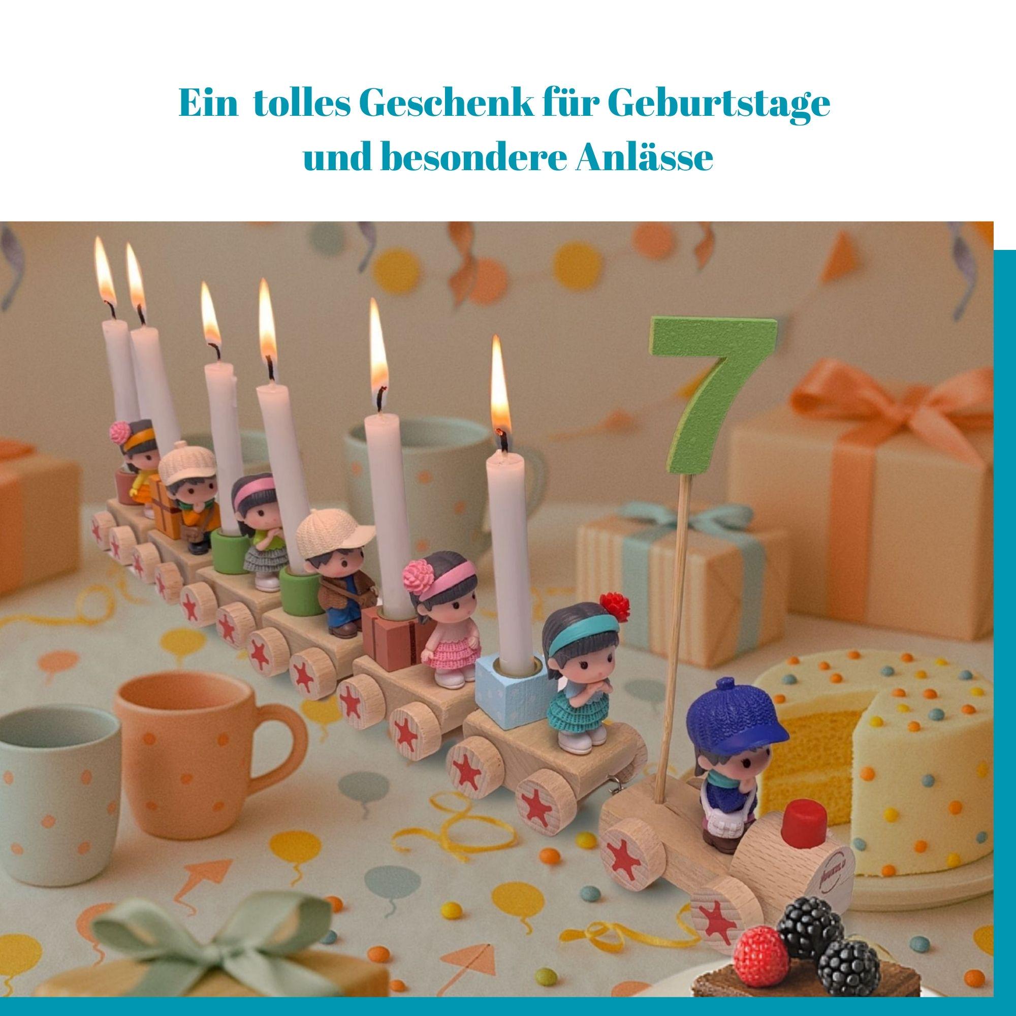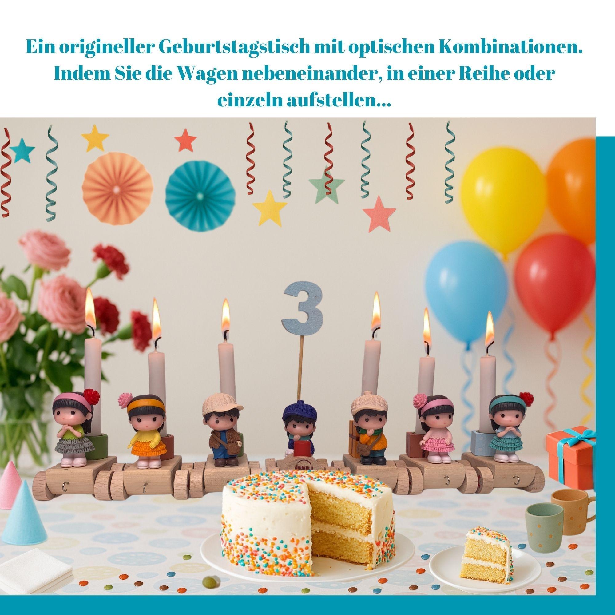 This beautiful birthday train, with its charming design and space for candles, brings a festive atmosphere to any birthday table. Whether used as a birthday wreath, decorative ring, or arranged on a birthday plate, it quickly becomes the centerpiece of any celebration. The high-quality materials and detailed design make it a durable companion for many years to come. Ideal as a gift or for your own use at children's birthdays and family gatherings, the individual elements can be arranged flexibly and expanded as desired. A lovely tradition that brings joy year after year. The wood used in this product is painted with paints that comply with the European toy safety standard EN 71/3.
